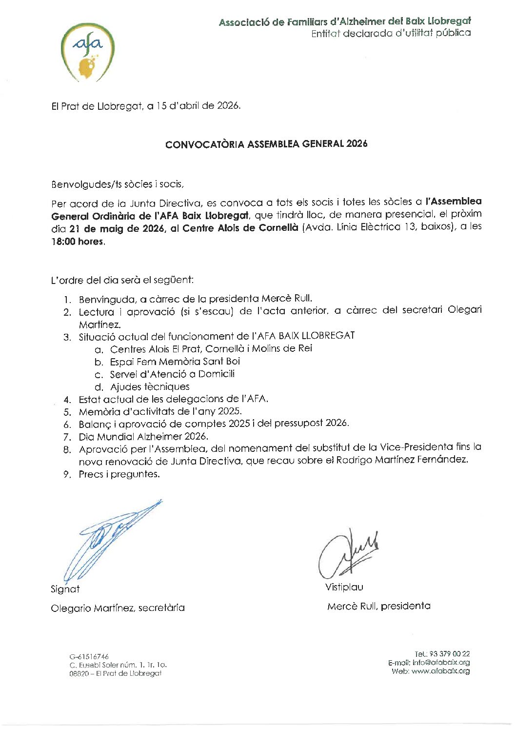 Centre Alois de Cornella de Llobregat Avda. Línia Elèctrica, 13 baixosConvocatòria de l’Assemblea General Ordinària 2026 de l’AFA Baix Llobregat el pròxim dia 21 de maig de 2026 a les 18h al Centre Alois de Cornellà de Llobregat.